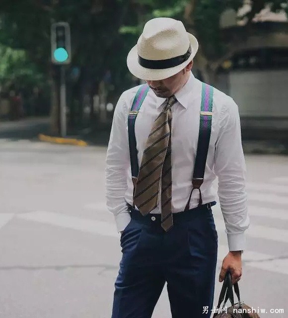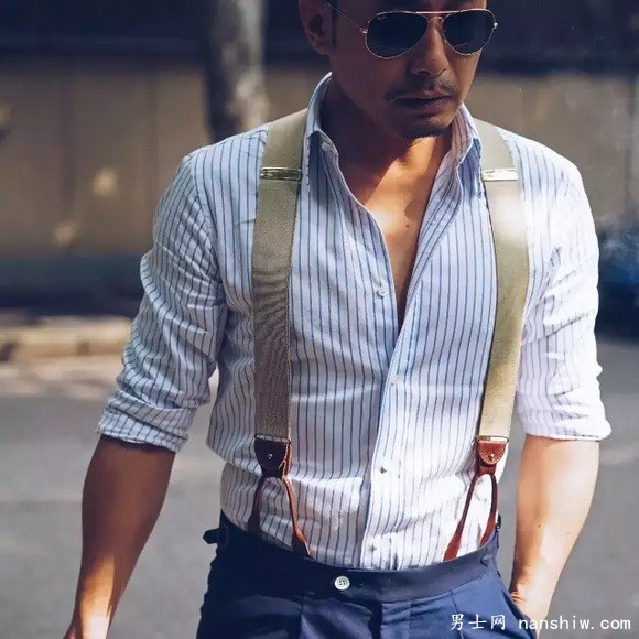 LOOK 3:休闲雅痞 想玩味?条纹衬衫不系扣,搭配一款纯色背带。你也能拥有夏日的随性不羁。